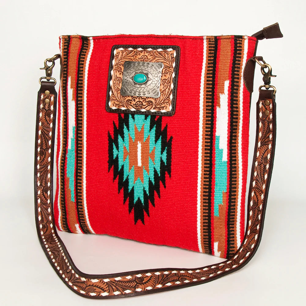 The shoulder strap is adjustable and made of 100% genuine vegetable tanned Cowhide Leather with a hand tooled pattern.