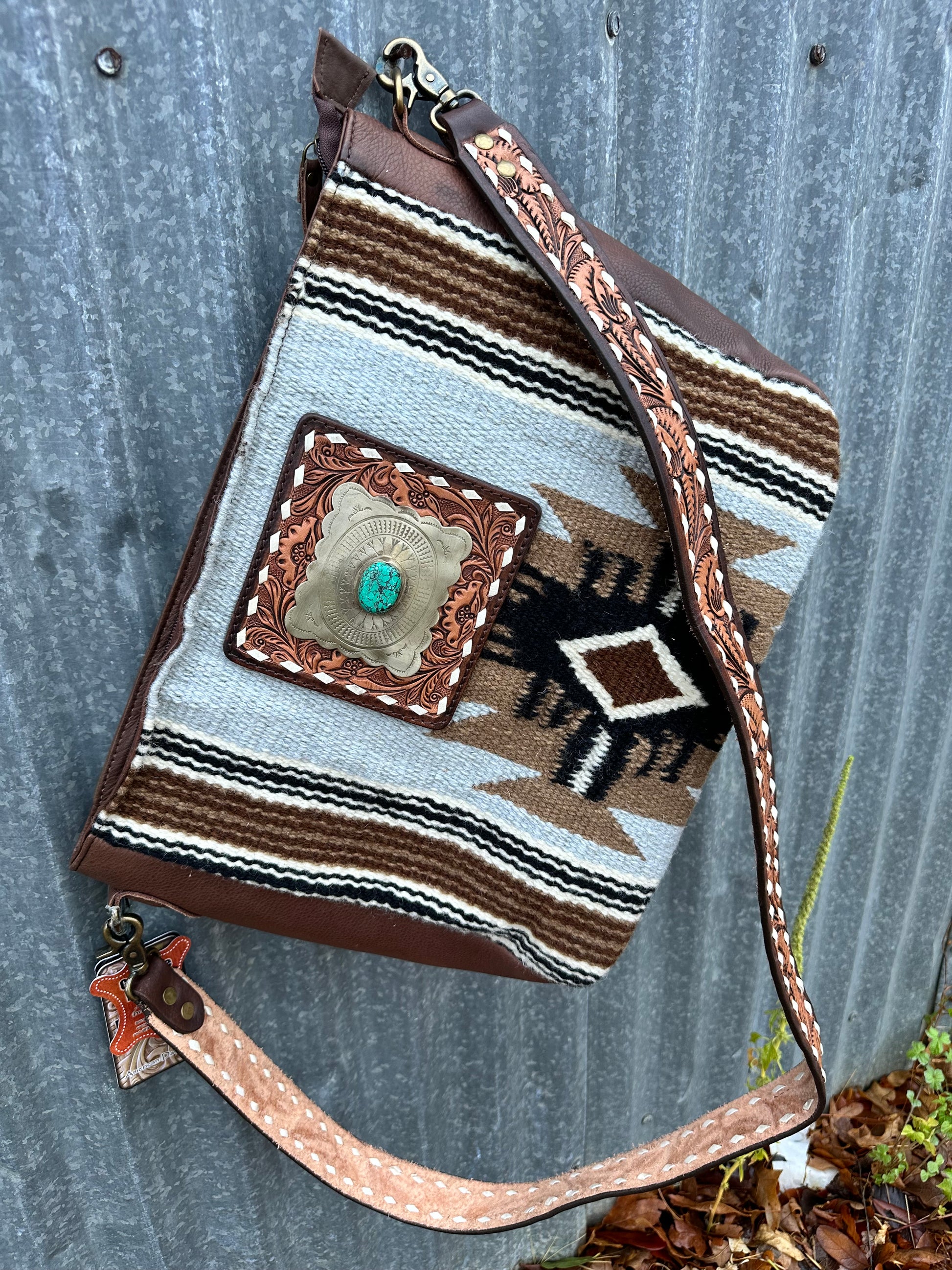 Saddle blanket purse with hand tooled strap and detailing. Metal and turquoise detail and concealed carry