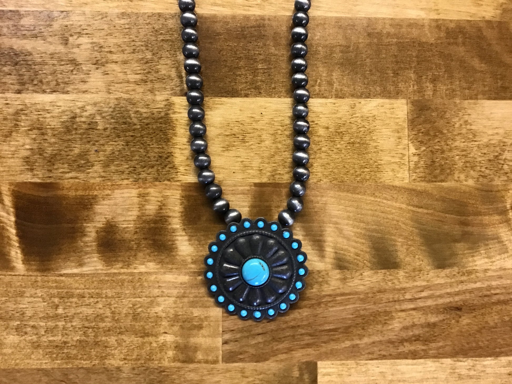 Beaded Necklace with Turquoise Stone that looks like Concho.