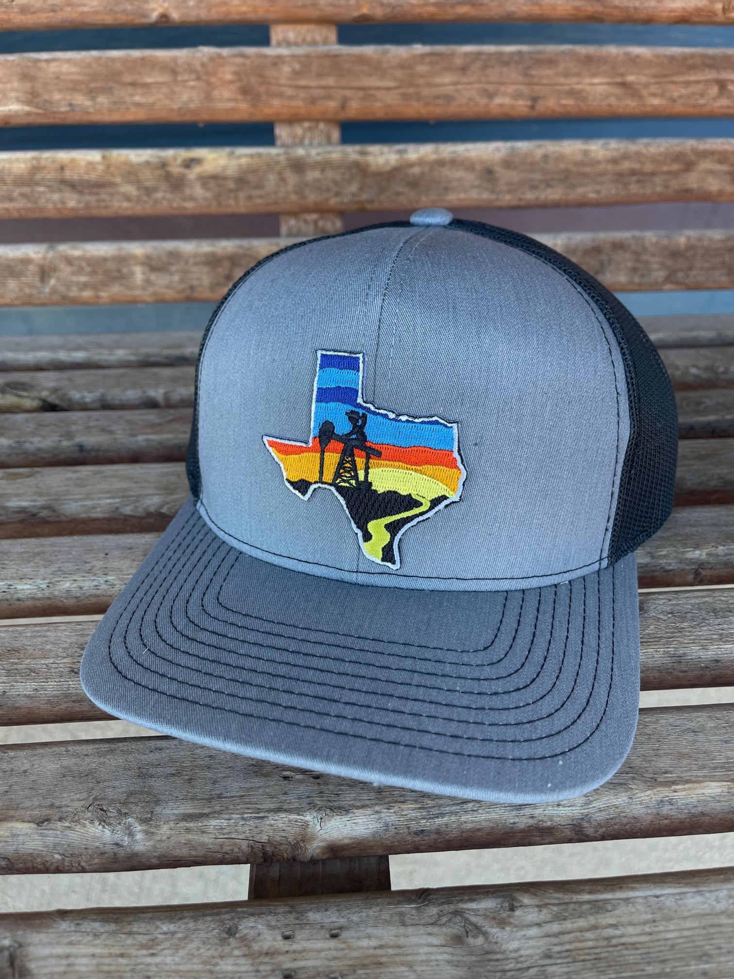 Grey snapback with black mesh. Pump Jack Cowboy on Texas sunset