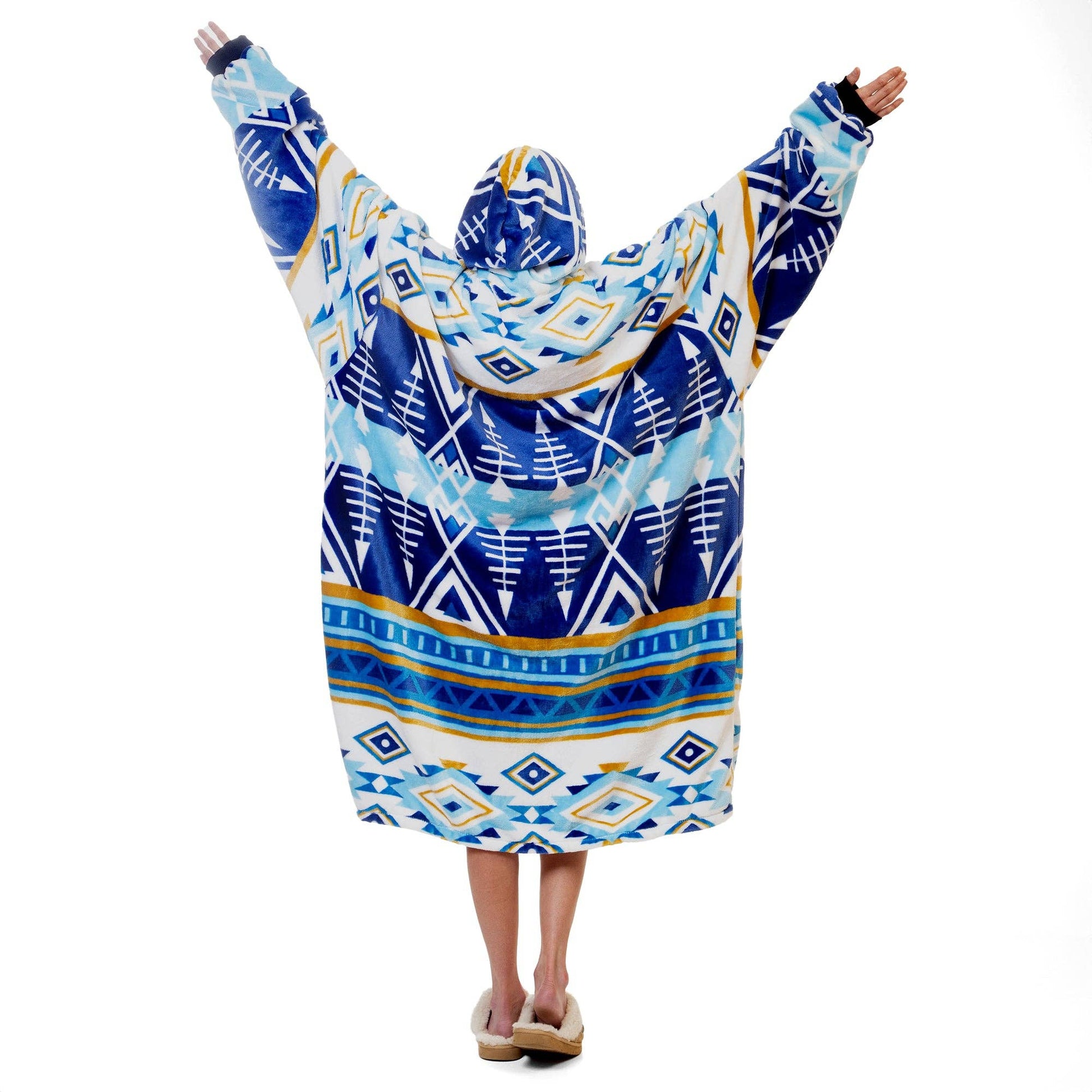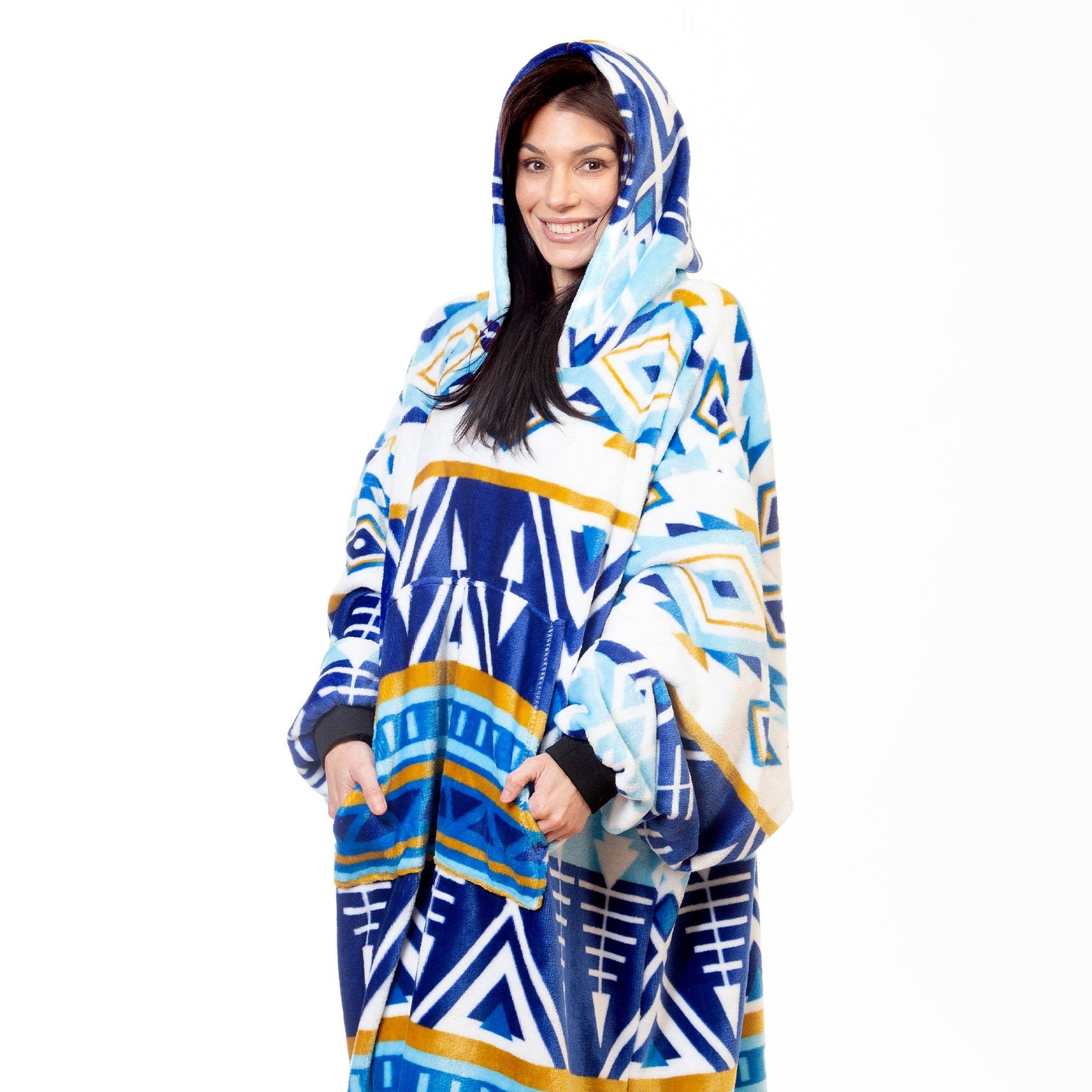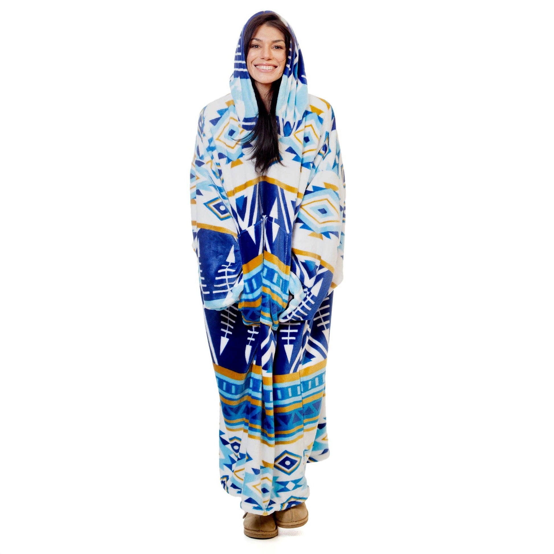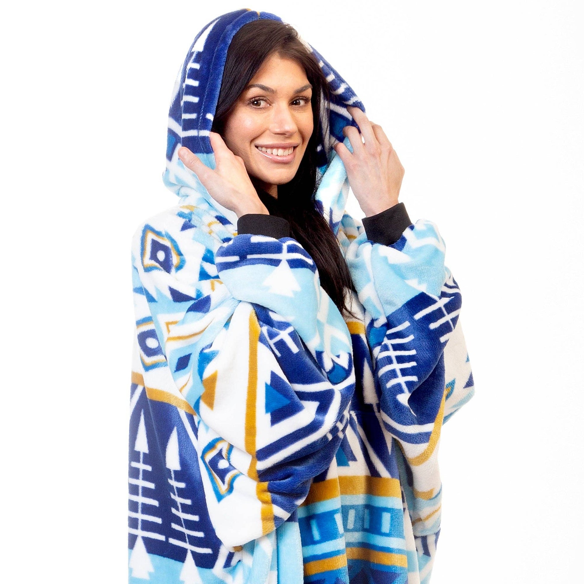 Hate having to get up and leave the warmth of a throw behind? Now you can wear the same super soft plush patterns you love while staying warm throughout the house! These hooded blankets are extra large to fit everyone with elastic sleeve cuffs and a kangaroo pocket.